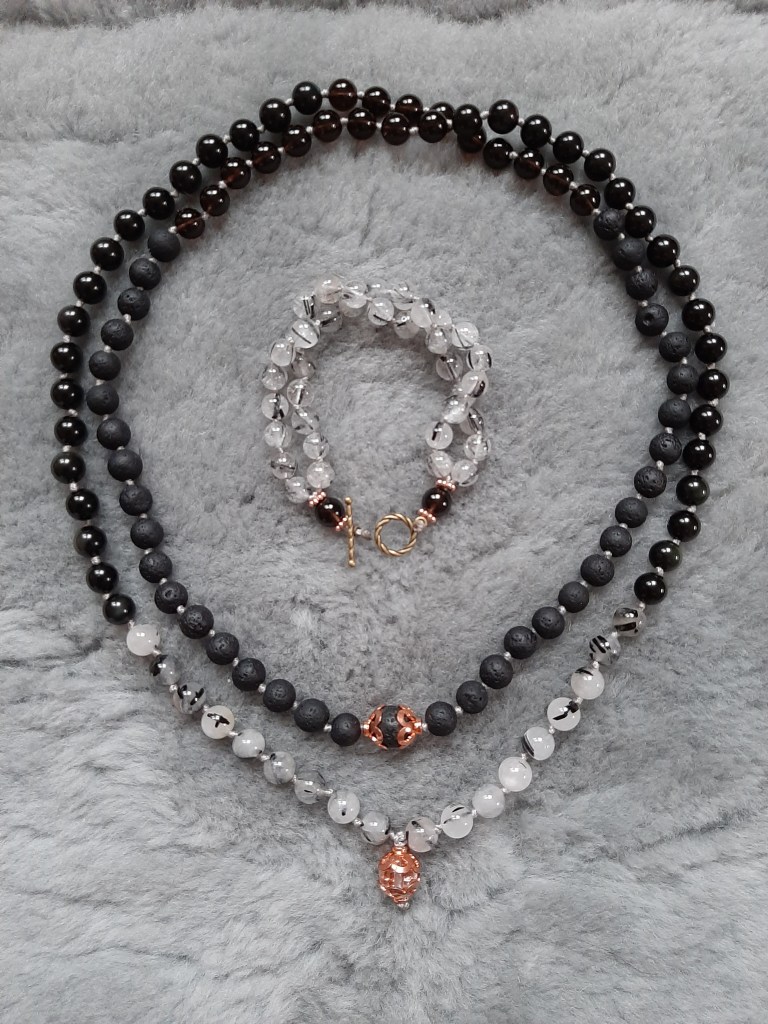 Lava rock, Rainbow obsidian, Smokey quartz, Tourmalated quartz, Clear quartz (guru bead), Copper bead caps.