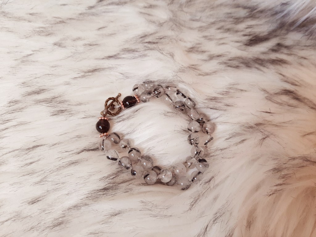 Bracelet: 6mm tourmalated quartz (quality A+) knotted beads with smokey quartz spacers