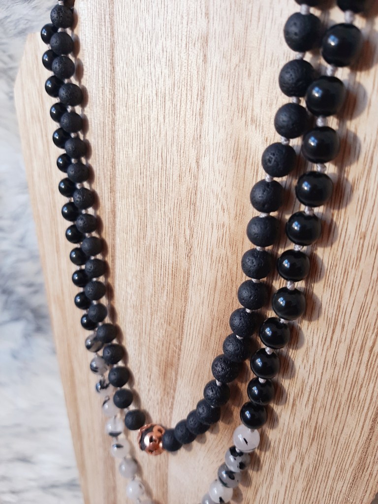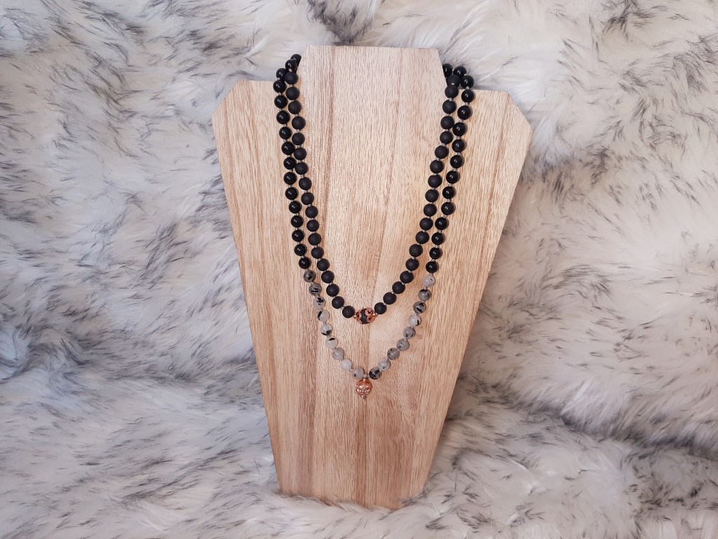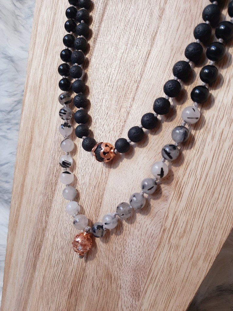 It can also be worn around the wrist to give more steadiness to the movement. Together with the bracelet the set becomes a solid presence that you feel, which will remind you to stay grounded. The left hand symbolizes receptiveness, the right hand symbolizes action. The right hand is better suited for these stones as they can steady one’s activities. It is best used for prayer or meditation as a counting tool. There are 108 beads and a guru bead. The significance behind the number 108 can be multifaceted and there are numerous interpretation. One of them is the following: 1 stands for God or higher Truth, 0 stands for emptiness or completeness in spiritual practice, and 8 stands for infinity or eternity.