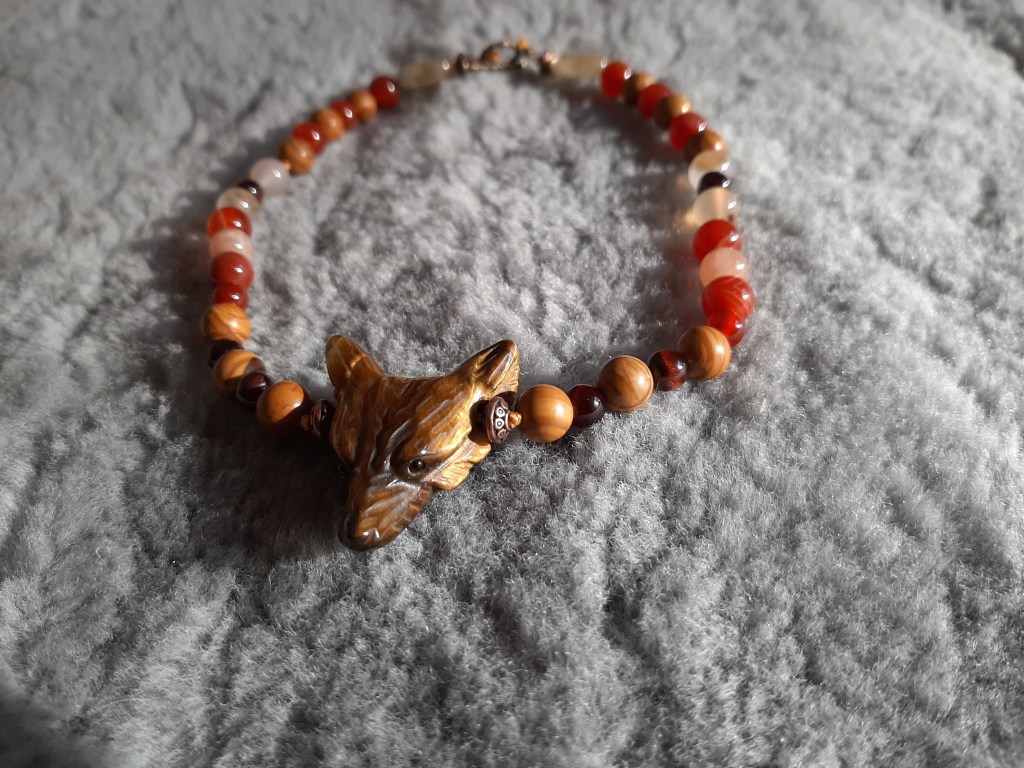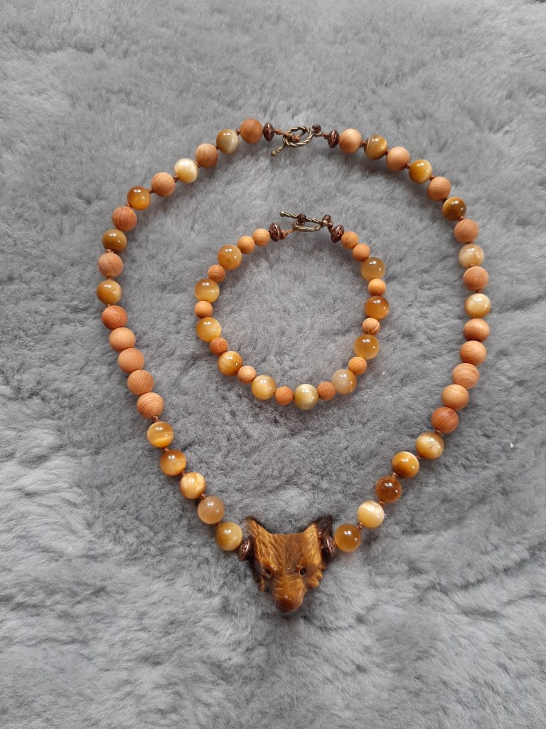 Blonde Tiger’s Eye and aromatic wood beads with a Tiger’s Eye Wolf pendant