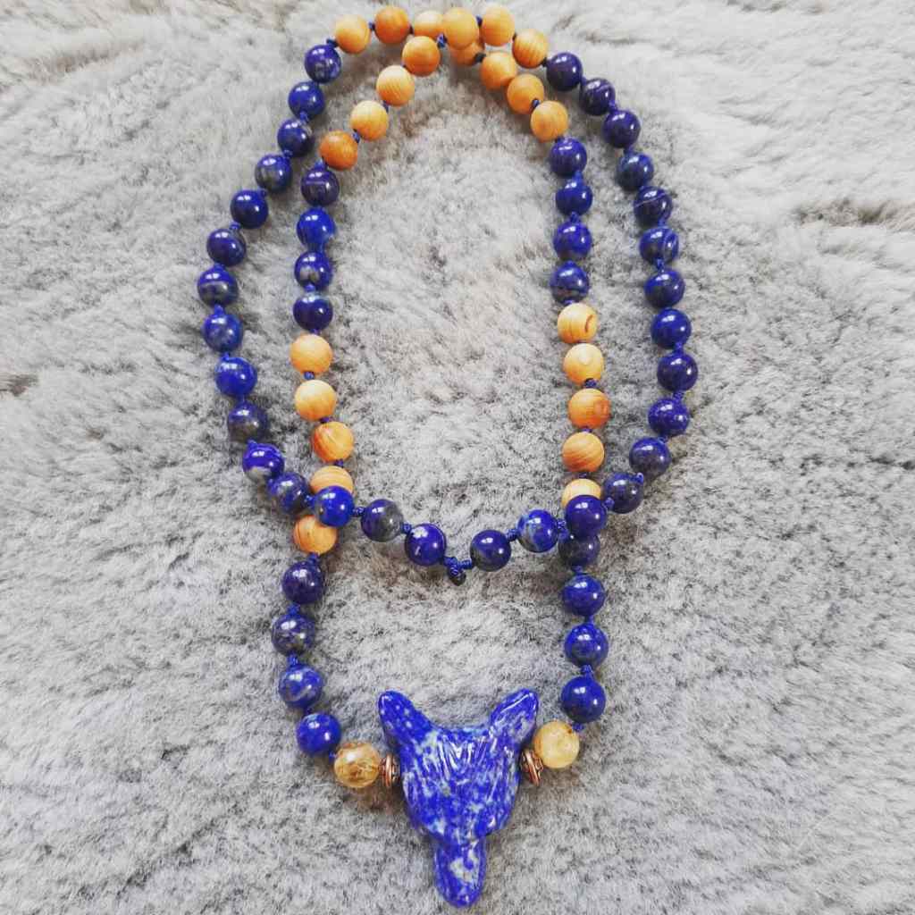 Lapis Lazuli, aromatic wood and citrine knotted beads with a Lapis Lazuli pendant